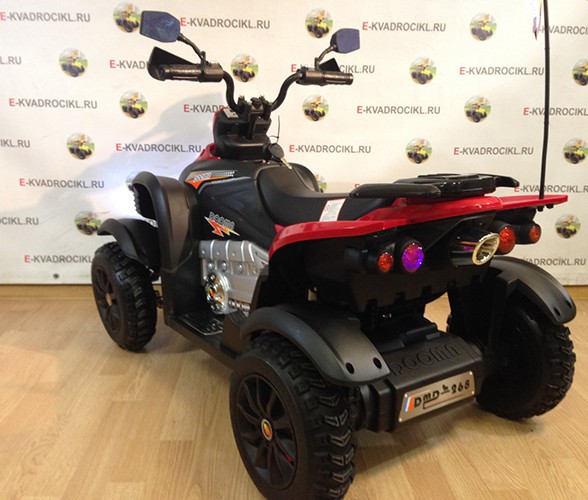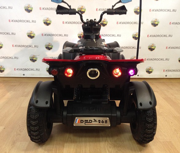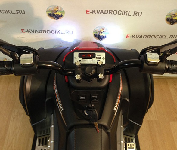 Электро квадроцикл догма приводится в движение 2-мя мощными моторчиками по 35 Вт, которые питаются от батареи 12В/7Ач. Фары сделаны светодиодными. Есть возможность проигрывания музыки с различных носителей, для которых предусмотрены специальные разъемы USB разъем, mini USB разъем, также в мультимедийную панель встроено FM-радио и заводские звуковые эффекты.