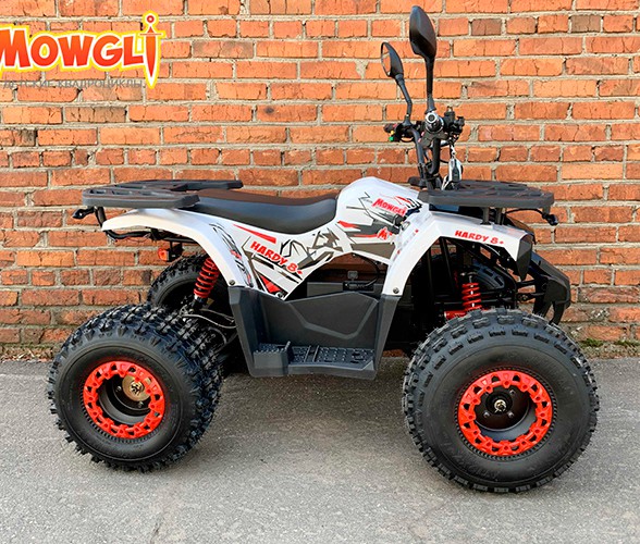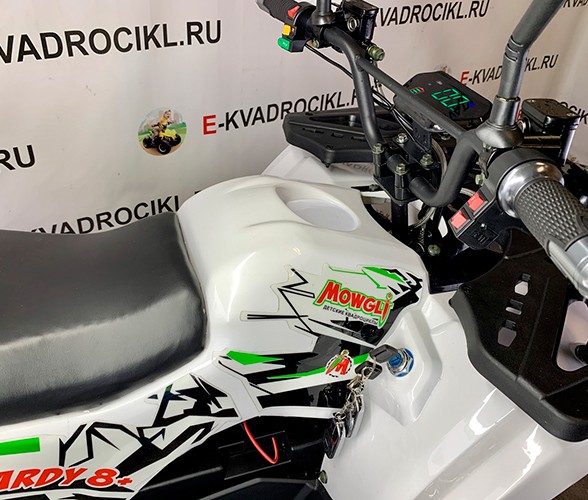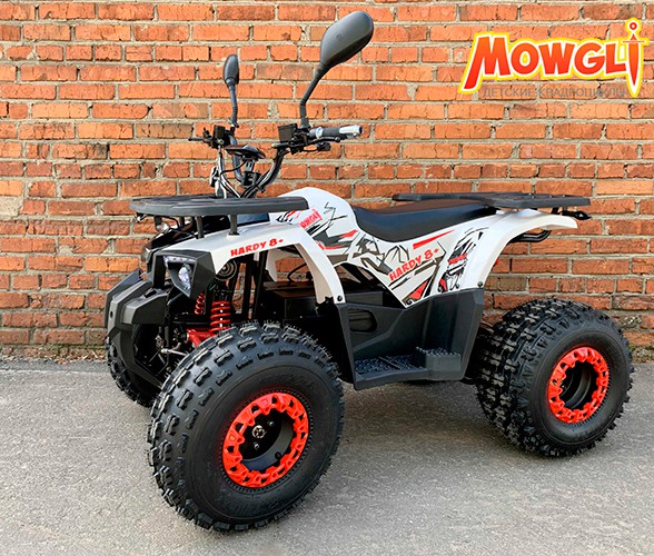 MOWGLI E-HARDY 8+ 1000W - мощный электрический квадроцикл, который подойдет для всей семьи. Данная модель комплектуется бесколлекторным электродвигателем с дифференциалом мощностью 1000 ватт, получающий питание от батарей 4*12V/32Ah = 48V/32Ah и приводящий в движение 8-ми дюймовые колеса.