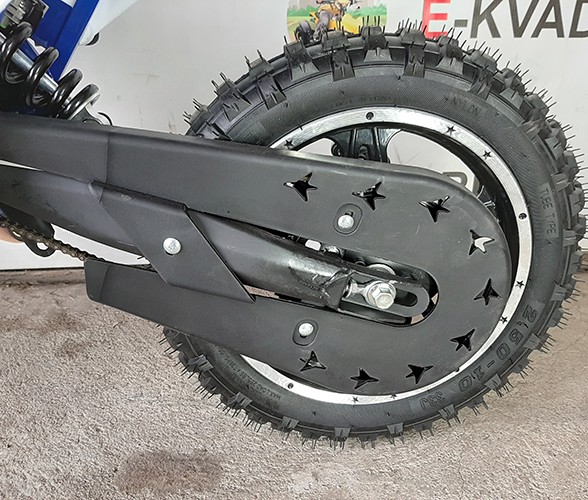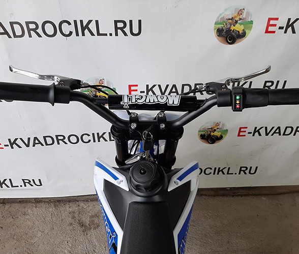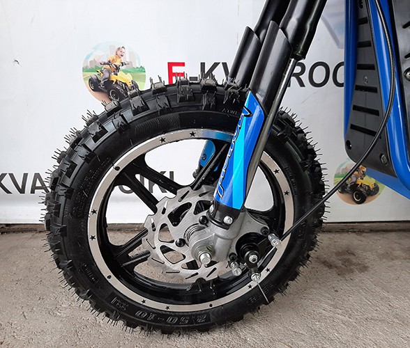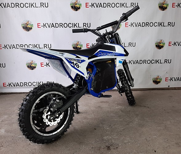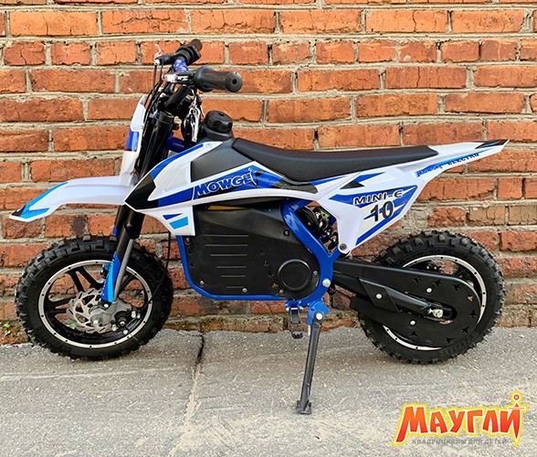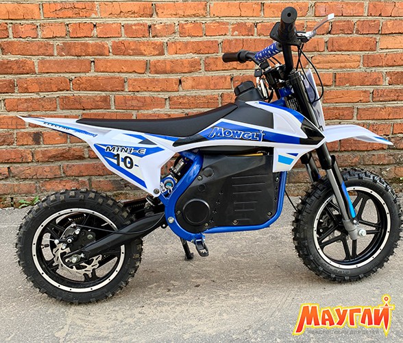 Питбайк оснащен 350 Вт электродвигателем, который питается от батарей 12V/9Ah*3 (36V), что в совокупности позволяет ему разгоняться до 30 км/ч. На МАУГЛИ МИНИ-Е 10/10 350 Вт установлены большие 10 дюймовые колеса, что делает его проходимым.