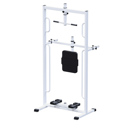 Рама тренажера изготовлена из стальной трубы сечением 80×40 мм, что обеспечивает высокую прочность и устойчивость конструкции. Верхний и нижний модули имеют угол поворота 360 градусов, что позволяет выполнять полноценные круговые движения без ограничений по амплитуде. Верхняя поворотная рукоять регулируется по высоте, обеспечивая удобство настройки под рост пользователя.