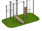 Перекладины изготовлены из трубы диаметром 34 мм и крепятся к стойкам в антивандальный стакан с защитой от выкручивания. Такое решение обеспечивает жёсткость соединений и устойчивость к механическому воздействию. Лавка выполнена из влагостойкой ламинированной фанеры толщиной 18 мм с противоскользящим тиснением, что повышает безопасность занятий и сохраняет эксплуатационные свойства материала в условиях открытого воздуха.