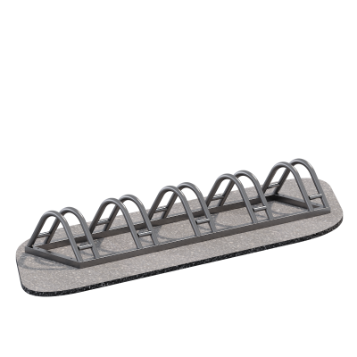 Велопарковка имеет пять секций для удержания колес, что позволяет надежно фиксировать велосипеды в вертикальном положении. Конструкция обеспечивает удобный доступ и оптимальное расстояние между местами для размещения транспорта.