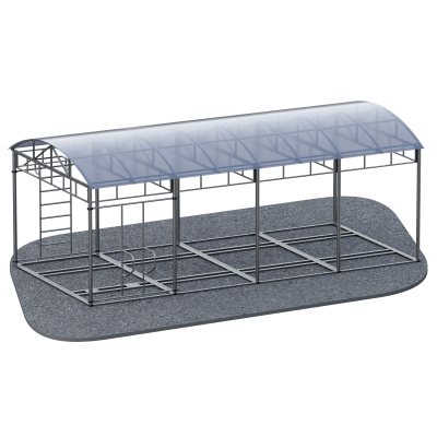 Крыша навеса выполнена из поликарбоната толщиной 6 мм. Материал отличается высокой прочностью, устойчивостью к атмосферным воздействиям и хорошей светопроницаемостью, создавая комфортные условия для тренировок.